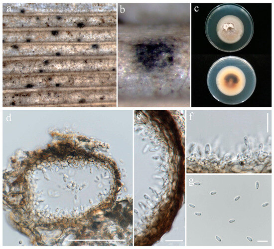 Setophoma oryzicola (MFLU 24-0097, holotype). (a,b) Appearance of conidiomata on the stem of Oryza sativa; (c) Top and reverse of colony on PDA; (d) Section through pycnidium; (e) Pycnidial wall; (f) Conidiogenous cells; (g) Conidia. Scale bars: (d) = 50 µm; (e,f) = 10 µm; (g) = 5 µm.