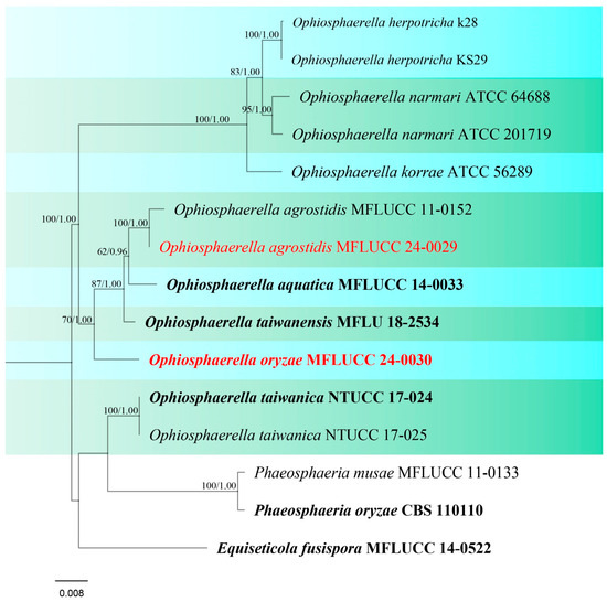 Notes: All three strains have a close phylogenetic affinity to the ex-type strain of Phaeosphaeria musae (MFLUCC 11-0151) with 60% ML and 0.99 BYPP support (Figure 6). Isolates MFLUCC 24-0044 and MFLUCC 24-0045 were found as sexual morphs and isolated from the post-harvest rice panicle. The asexual morph (strain MFLUCC 24-0046) was isolated from a symptomatic rice panicle (variety Pathum Thani 60) (Table 2). To our knowledge, this is the first report of the asexual morph of P. musae, and a new host record from rice. Herein, we establish the sexual–asexual connection of Phaeosphaeria musae.