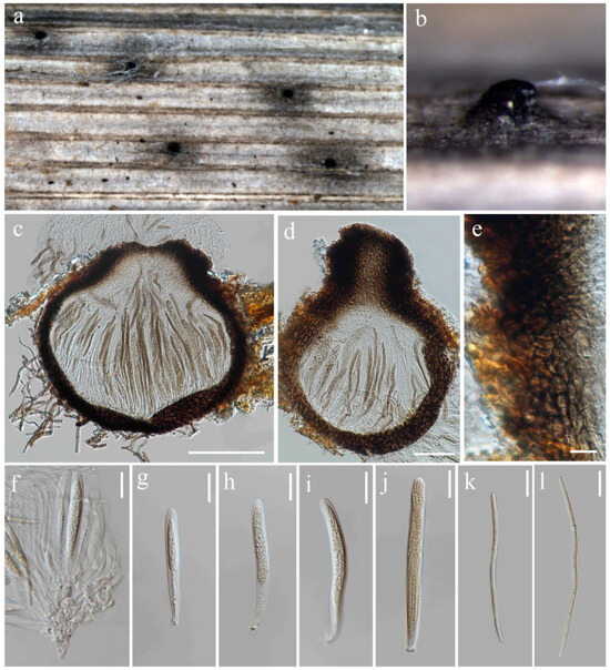 Asexual morph of Phaeosphaeria musae (MFLU 24-0100). (a,b) Appearance of conidiomata on the panicle of Oryza sativa; (c) Top and reverse of colony on PDA; (d) Peridial wall; (e,f) Conidiogenous cells; (g–l) Conidia. Scale bars: (d) = 20 µm; (e–l) = 10 µm.