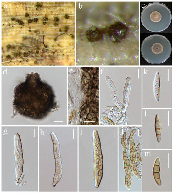 - Phookamsak, R.; Jiang, H.; Suwannarach, N.; Lumyong, S.; Xu, J.C.; Xu, S.; Liao, C.F.; Chomnunti, P. Bambusicolous fungi in Pleosporales: Introducing four novel taxa and a new habitat record for Anastomitrabeculia didymospora. J. Fungi 2022, 8, 630. [Google Scholar] [CrossRef]