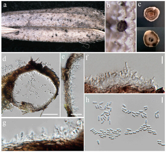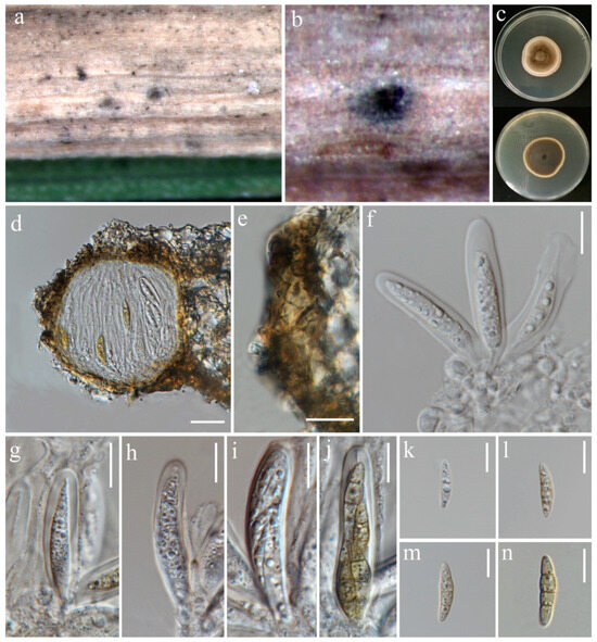 - Thambugala, K.M.; Wanasinghe, D.N.; Phillips, A.J.L.; Camporesi, E.; Bulgakov, T.S.; Phukhamsakda, C.; Ariyawansa, H.A.; Goonasekara, I.D.; Phookamsak, R.; Dissanayake, A.; et al. Mycosphere notes 1–50: Grass (Poaceae) inhabiting Dothideomycetes. Mycosphere 2017, 8, 697–796. [Google Scholar] [CrossRef]