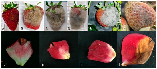 Grey mould symptoms on strawberry fruits (A–F) and rose petals (G–J).