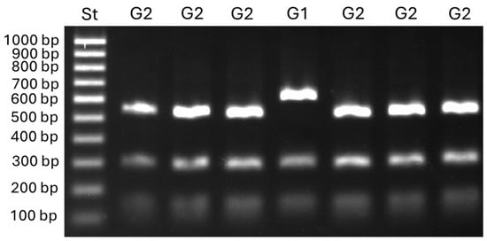 All isolates underwent molecular analysis: (i) TE profiles were determined using PCR primers specific to Boty and Flipper []; (ii) cytb gene structure was assessed according to De Miccolis Angelini et al. [] and Habib et al. []; (iii) strains belonging to group I or group II of the Botrytis genus were distinguished by Bc-hch RFLP analysis []; (iv) B. cinerea group S strains were identified by the mrr1 PCR assay []. In detail, the PCR mixtures (25 μL) consisted of 1× Green GoTaq Flexi Buffer (Mg2+ free), 2 mM MgCl2, 75 μM of each dNTP nucleotide, 0.5 μM of each primer, 0.75 U of GoTaq DNA polymerase (all PCR reagents were from Promega Corp., Madison, WI, USA), and 50 ng of genomic DNA. The primer pairs used are listed in Table 2. A control with no template was always run. HhaI restriction enzyme (New England Biolabs Ltd., Hitchin, UK) was employed for Bc-hch RFLP analysis in a 10 µL mixture consisting of 1× CutSmart™ Buffer, 2 U of enzyme, and 4 µL of PCR product, and the digestion reaction was carried out at 37 °C for 30 min. The results were visualized after 110 min of electrophoresis run on a 1.5% agarose gel at 110 V using SYBR Safe DNA gel stain (Thermo Fisher Scientific, Waltham, MA, USA).