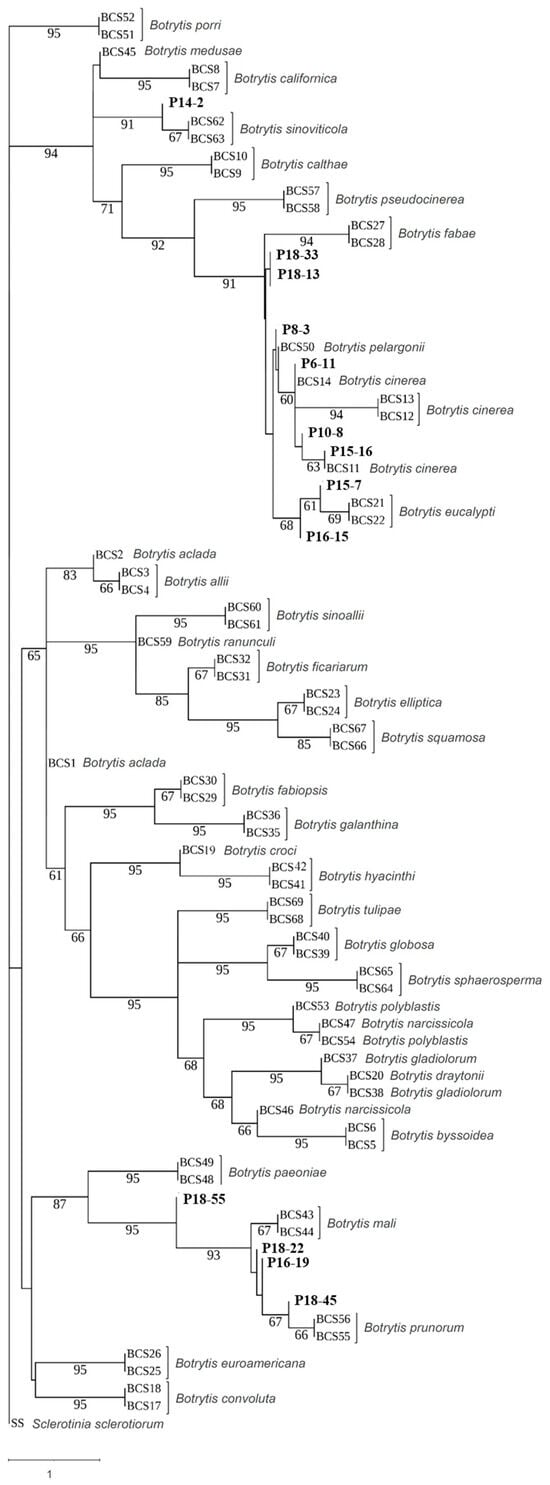 Several molecular markers have been used for genetic identification and phylogenetic relationships within Botrytis species. Phylogenetic analysis has divided the genus Botrytis into two clades based on the Bc-hch gene sequence, with B. cinerea falling under the clade of species (Botrytis clade 1) that infects a wide host range of dicotyledonous plants and is clearly distinguished from clade 2, which contains Botrytis species with a restricted host range in both monocotyledonous and dicotyledonous plants []. Three housekeeping genes, glyceraldehyde-3-phosphate dehydrogenase (g3pdh), heat shock protein 60 (hsp60), and subunit II RNA polymerase (rpb2), and the necrosis- and ethylene-inducing protein (nep1 and nep2) genes, have been used to corroborate the identification of Botrytis species [,,,]. Additionally, the sequencing of the multidrug resistance regulator 1 (mrr1) gene and several other genes distinguished a subgroup of isolates within grey mould populations, named B. cinerea group S, that was found to be predominant on strawberry in Germany []. These findings further highlight the need for accurate species identification and understanding intraspecific variability.
