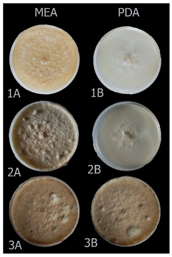 The single-spore isolates were cultured on malt extract agar (MEA; 20 g malt extract Oxoid, 20 g agar, per litre) at 21 ± 1 °C in darkness for 2–3 days. Subsequently, five small (2–4 mm) mycelial agar plugs from each isolate were singularly transferred onto 90 mm MEA plates overlaid with sterile cellophane films. The cultures were then incubated at 21 ± 1 °C for an additional two days to obtain fresh mycelium. Genomic DNA extraction was carried out from freeze-dried mycelium using the CTAB method as described by De Miccolis Angelini et al. []. The quality and concentration of the extracted DNA were determined using a Nanodrop 2000 spectrophotometer (Thermo Fisher Scientific Inc., Wilmington, DE, USA), and it was stored at −20 °C until use.