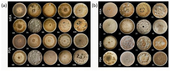 Various colony morphologies of Botrytis cinerea (a) and B. prunorum (b) on MEA and PDA after 21 days of incubation. Among B. cinerea strains, 1—P13-5; 2—P11-4; 3—P6-9; 4—P8-11; 5—P2-2; 6—P3-3; 7—P7-4; 8—P18-29; 9—P18-6; and 10—P7-3; among B. prunorum strains, 1—P11-14; 2—P10-3; 3—P11-10; 4—P16-17; 5—P16-19; 6—P8-9; 7—P18-38; and 8—P18-22.