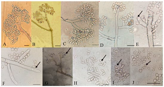 Microscopic characteristics of Botrytis cinerea isolates. (A–D) Conidia attached to conidiophore, (E–G) conidiophore terminal, (H) elongated conidia, (I) septate conidia, (J) microconidia. Bar = 20 μm. The strains shown are (A) P13-5; (B) P8-11; (C) P7-4; (D) P18-6; (E) and (F) P7-3; (G) P3-3; (H) P7-4; (I) P2-2; and (J) P7-3.
