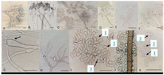 Microscopic characteristics of Botrytis prunorum. (A–D) Conidia attached to conidiophore and a normal (E), swollen (F), and thin (H) conidiophore terminal. (G) Conidiophore swelling, elongated (1I), and pyriform conidia (2I), conidium with hilum (3I), (J) common conidia, and round (1K), small (2K), and large (3K) septate conidia. Bar = 20 μm. The strains shown are (A) P11-14; (B) P16-17; (C) P18-38; (D) P8-9; (E) P10-3; (F) P11-10; (G) P18-22; (H) P16-19; (I) P10-3; (J) P8-9; and (K) P10-3.