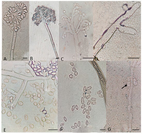 Microscopic characteristics of Botrytis sinoviticola strain P14-2. (A,B) Conidia attached to conidiophore, (C,D) conidiophore terminal, (E,F) unicellular conidia, and (G) septate conidia. Bar = 20 μm.