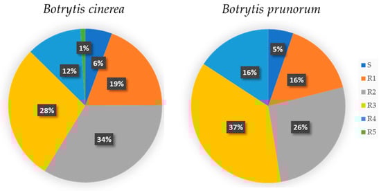 Distribution pattern of fungicide resistance profiles among Botrytis cinerea and Botrytis prunorum strains, grouped in the following categories: sensitive to all used fungicides (S), and resistant to one (R1), two (R2), three (R3), four (R4), and five (R5) classes of fungicides.