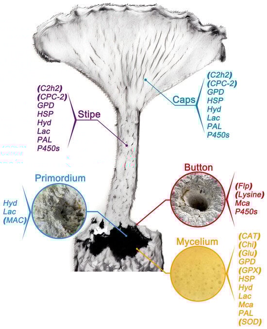 Distribution of yield-related gene expression at different stages of mushroom growth, including the mycelium, primordium, button, and fruiting body stages. Genes expressed at specific stages are labeled in parentheses. Catalase (CAT); Chitinases (Chi); Cytochrome P450s (P450s); Cys2His2 zinc finger protein (C2h2); Fasciclin-like protein 1 (Flp); Gβ-like protein CPC-2 (CPC-2); Glucanases (Glu); Glyceraldehyde-3-phosphate dehydrogenase (GPD); Glutathione peroxidase (GPX); Heat shock protein (HSP); Hydrophobin (Hyd); Copper-sensing transcription factor (MAC); Laccase (Lac); Lysine methyltransferase (Lysine); Metacaspase (Mca); Phenylalanine ammonia-lyase (PAL); Superoxide dismutase (SOD).