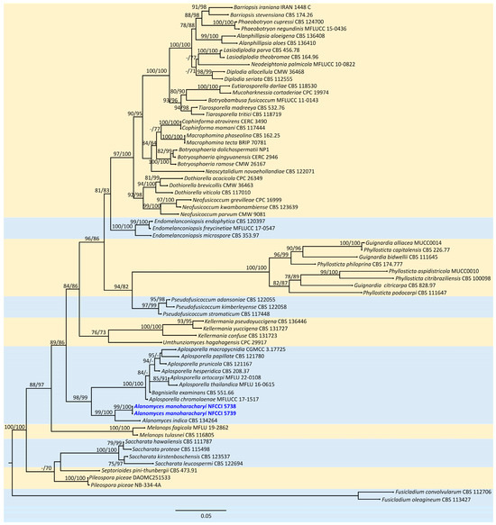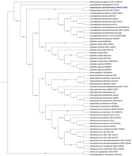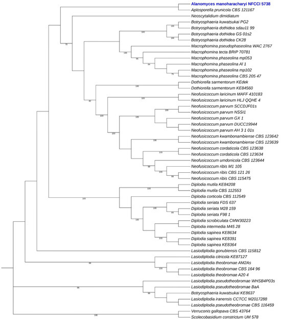 Combined phylogenetic analysis using ITS and LSU nested the Alanomyces manoharacharyi isolate in a distinct and unique clade in the family Aplosporellaceae. The clade was well supported with robust SH-like aLRT and ultrafast bootstrap (UFBoot) (Figure 1).