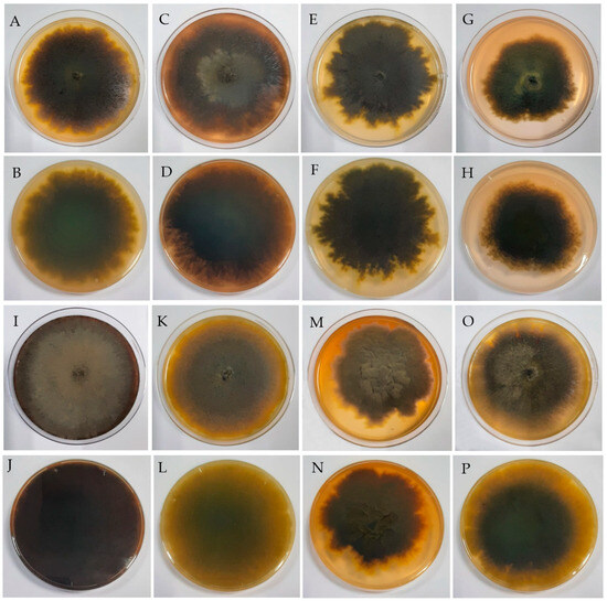 Colonies on various media after 10 days. (A,B) MEA; (C,D) V8 juice agar; (E,F) CMA; (G,H) RBA; (I,J) CDA; (K,L) PCA; (M,N) SDA; (O,P) PDA; (A,C,E,G,I,K,M,O) front view; (B,D,F,H,J,L,N,P) reverse view.