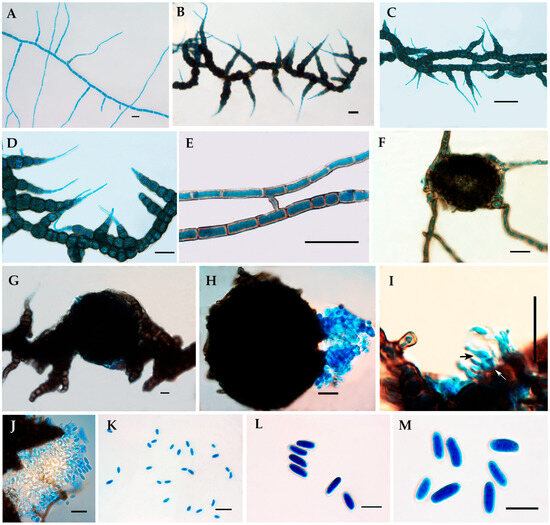 Alanomyces manoharacharyi NFCCI 5738; (A–D) Hyphae; (E) Hyphae showing anastomosis; (F,G) Conidiomata; (H) Ruptured conidiomata; (I) Ruptured conidiomata showing numerous dense conidiophores; the black arrow shows ampulliform conidiogenous cells; the white arrow shows short, stumpy conidiophores; (J) Ruptured conidiomata with numerous conidia; (K–M) Conidia. Bar = 20 µm (A–K), 10 µm (L,M).