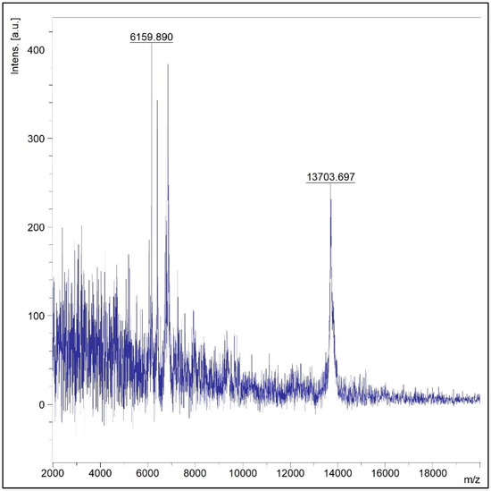 MALDI-TOF MS spectra of the protein profile (2–20 KD) of Alanomyces manoharacharyi NFCCI 5738 were studied using MALDI-TOF Mass Spectrometry (Figure 4 and Table 3). Interestingly, and as expected, the results displayed “No organism identification possible” with a score value of 1.17 as this isolate is novel and did not match with the existing species listed available in the database. MALDI-TOF MS spectra also indicate the novelty of the isolate.