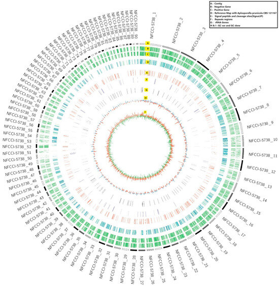 The genome sequence of Alanomyces manoharacharyi NFCCI 5738 was assembled and deposited in the NCBI GenBank database (BioProject PRJNA1114393; BioSample SAMN41484321). To represent the genome of A. manoharacharyi NFCCI 5738, the contigs were sorted from largest to smallest and the top 90 contigs were represented using CIRCOS as a genome diagram. The genome diagram of A. manoharacharyi NFCCI 5738 shows that there are nine circles in the circle diagram (Figure 5), which are as follows from inside to outside: the first circle in orange and green (I) shows the GC skew, the second circle in red and blue (H) represents GC variation, the third circle in black (G) represents rRNA genes, the fourth circle in purple (F) represents repeat regions, the fifth circle in red (E) represents the signal peptide and cleavage site (Signal LIP), the sixth circle in blue and green (D) represents the reference map with Aplosporella prunicola CBS 121167, the seventh circle in green (C) indicates that CDS is in a positive chain, and the eighth circle in green (B) indicates that CDS is in a negative chain. The outer rim shows the contigs.