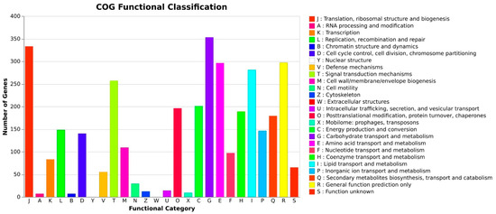 As per the COG database, “Carbohydrate transport and metabolism” was related to many genes (353), followed by “Translation, ribosomal structure and biogenesis (333)”, “General function prediction only (297)”, “Amino acid transport and metabolism (296)”, “Lipid transport and metabolism (281)”, and “Signal transduction mechanisms (258)” (Figure 6) [45]. These results depict that A. manoharacharyi NFCCI 5738 possesses a varied and enriched array of functions for carbohydrates, amino acid metabolism, and lipid transport and metabolism that may favor better energy conversion efficiency.