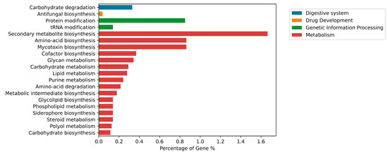 The findings from the KEGG functional classification suggest that the predicted proteins fell under various categories, such as digestive system (26) [carbohydrate degradation (26)]; drug development (3) [antifungal biosynthesis (3)]; genetic information processing (80) [protein modification (67), tRNA modification (11), bacterial outer membrane biogenesis (1), cell wall biogenesis (1)]; and metabolism (635) [secondary metabolite biosynthesis (131), amino-acid biosynthesis (68), mycotoxin biosynthesis (68), cofactor biosynthesis (29), glycan metabolism (27), carbohydrate metabolism (23), lipid metabolism (22), purine metabolism (19), amino-acid degradation (17), metabolic intermediate biosynthesis (14), glycolipid biosynthesis (11), phospholipid metabolism (11), siderophore biosynthesis (11), steroid metabolism (11), polyol metabolism (10), carbohydrate biosynthesis (9), pigment biosynthesis (9), sulfur metabolism (9), carbohydrate acid metabolism (8), nucleotide-sugar biosynthesis (8), pyrimidine metabolism (8), polyketide biosynthesis (7), xenobiotic degradation (7), alkaloid biosynthesis (6), amine and polyamine biosynthesis (6), aromatic compound metabolism (6), nitrogen metabolism (6), one-carbon metabolism (6), porphyrin-containing compound metabolism (6), energy metabolism (4), glycan degradation (4), isoprenoid biosynthesis (4), protein biosynthesis (4), sesquiterpene biosynthesis (4), steroid biosynthesis (4), glycan biosynthesis (3), glycerolipid metabolism (3), hormone biosynthesis (3), organic acid metabolism (3), alcohol metabolism (2), amino-acid metabolism (2), antibiotic biosynthesis (2), carotenoid biosynthesis (2), cofactor degradation (2), cofactor metabolism (2), organosulfur degradation (2), phytoalexin biosynthesis (2), alkaloid degradation (1), amine and polyamine degradation (1), amino-sugar metabolism (1), flavonoid metabolism (1), ketone metabolism (1), membrane lipid metabolism (1), phytotoxin biosynthesis (1), plant hormone metabolism (1), secondary metabolite metabolism (1), sphingolipid metabolism (1)] (Figure 7) [46]. The results indicate that a varied and enriched array of metabolic functions is present that will probably provide higher secondary metabolism efficacy.