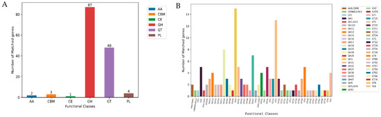 Carbohydrate-active enzymes (CAZymes) represent a diverse group of enzymes responsible for both breaking down and building up glycoconjugates, as well as various forms of glycans, such as oligosaccharides and polysaccharides [48]. These enzymes are pivotal in fungal metabolism, facilitating carbohydrates’ degradation, modification, and biosynthesis [49]. The CAZy database is a specialized resource for carbohydrate enzymes, encompassing their ability to alter, create, and dismantle glycosidic bonds [49]. The analysis showed 145 genes encoded for CAZymes dispersed in the A. manoharacharyi NFCCI 5738 genome. These include two auxiliary activities (AAs), three carbohydrate-binding modules (CBMs), one group of carbohydrate esterases (CEs), eighty-seven glycoside hydrolases (GHs), fourty-eight glycosyltransferases (GTs), and four polysaccharide lyases (PLs; Figure 9A). Details of the families are shown in Figure 9B. These findings show that A. manoharacharyi NFCCI 5738 can show a remarkable ability to make and break complex carbohydrates and is possibly a candidate for industrial applicability.
