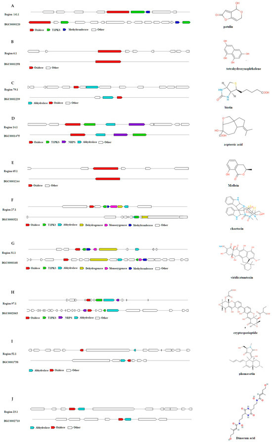 Secondary metabolites biosynthetic gene cluster analysis of Alanomyces manoharacharyi NFCCI 5738 was carried out by AntiSMASH fungal 7.1.0 [37]. To further study the obtained gene clusters, the NCBI Genome Portal Software Platform (https://www.ncbi.nlm.nih.gov/home/genomes/, accessed on 26 August 2024) was used to conduct Blastp analysis and gene annotation and then concluded the gene clusters of secondary metabolites in A. manoharacharyi NFCCI 5738.