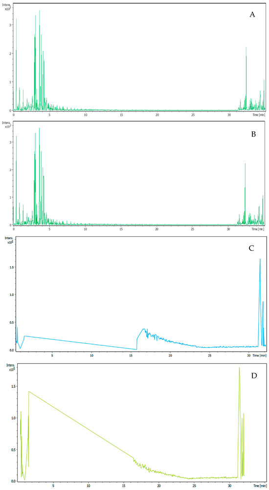 The metabolomic analysis was conducted using an Ultra-High-Performance Liquid Chromatography (UHPLC) system (Elute UHPLC, Bruker, Billerica, MA, USA). This system was equipped with a quaternary pump coupled with an Ion Trap mass spectrometer (Amazon Speed, Bruker) that utilized an Electrospray Ionization (ESI) interface. Chromatographic separation was achieved using an Acquity BEH C18 reversed-phase column (50 × 2.1 mm, 1.7 μm particle size) (Waters, Milford, MA, USA). The column was maintained at a temperature of 30 °C. The mobile phases consisted of an aqueous solution of 5 mM ammonium acetate and formic acid (FA), used in both positive and negative modes. The flow rate was kept constant at 0.3 mL/min. The gradient elution was optimized to start with 95% of Mobile Phase A, followed by a linear decrease to 25% of Mobile Phase B over 18 min. This was then reduced to 2% B over the next 5 min, held for 7 min, and then switched to 95% B. The column was equilibrated to the initial conditions over the next 5 min, resulting in a total analysis time of 35 min. The injection volume for the samples was set at 5 μL. The ESI-MS/MS analysis was performed in AUTO MSn mode, operating in positive and negative polarities. Two MS/MS transitions were acquired per analyte, with a dwell time between 0.017 and 0.130 s. The maximum accuracy time in the trap control section was 50 ms and the scan range was 100 to 2000 m/z. The nebulizer temperature was set at 29.0 psi, the dry gas flow rate was 10 L/min, and the dry temperature was 126.9 °C. The capillary voltage and end plate offset were set at 4500V and 500V, respectively. The ICC target in negative mode was 70,000 and in positive mode was 200,000.