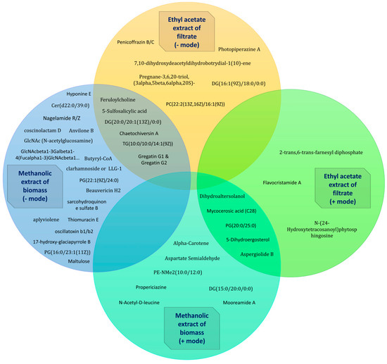 Alanomyces manoharacharyi was initially grown on PDA for four days. Then, a single colony from PDA was inoculated in 1.2 L (400 mL × 3) potato dextrose broth in a 2 L Erlenmeyer flask (3 No.) at 180 rpm at 26 °C for a week. Later, the biomass was separated from the filtrate using Whatman No. 4 filter paper. The filtrate was extracted twice with an equal volume of ethyl acetate. The ethyl acetate extract was dried in a rotatory evaporator. The dried extract was dissolved in methanol. The biomass obtained was rinsed twice with distilled water and filtered. The biomass was dried at 45 °C and extracted overnight using methanol. Later, this biomass and methanolic mixture was subjected to sonication and filtered through Whatman No. 4 filter paper. This filtered methanolic extract was dried in a rotatory evaporator. The dried extract was dissolved in methanol. The extracts were diluted to a concentration of 1 mg/mL for further analysis.