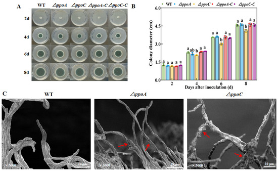 3.4. Loss of PePpoA or PePpoC Affects Colony Growth and Hyphal Morphology of P. expansum