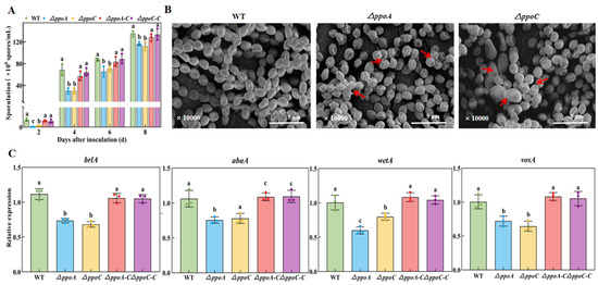 3.5. Loss of PePpoA or PePpoC Affects Sporulation and Spore Morphology of P. expansum