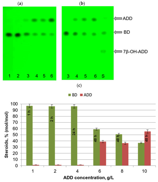 TLC profile of ADD transformation ((a)—6 h, (b)—48 h) by resting Curvularia sp. mycelium in the presence of protein synthesis inhibitor cycloheximide CHX (0.05 mg/mL); steroid substrate loads: 1 g/L (variant 1); 2 g/L (variant 2); 4 g/L (variant 3); 6 g/L (variant 4); 8 g/L (variant 5); 10 g/L (variant 6); S—a mixture of reference steroids in the order (from top to bottom): androstenedione (ADD); boldenone (BD); 7β-hydroxyandrostenedione (7β-OH-ADD). (c) Maximum BD yield detected in the culture broth samples at various intervals (1–48 h) while resting Curvularia sp. mycelium were incubated with ADD loaded in different concentrations.