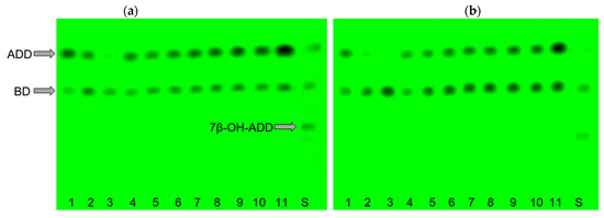 TLC profile of ADD (10 g/L) bioconversion in the presence of CHX (0.05 mg/mL) ((a)—24 h, (b)—48 h) by resting Curvularia sp. mycelium loaded to 20 g/L (variant 1), 40 g/L (variant 2), 60 g/L (variant 3), or 80 g/L (variant 4) without methylated β-cyclodextrin (MCD) addition (variant 1) or in the presence of MCD in a molar ratio of ADD 0.2:1 (variant 5), 0.5:1 (variant 6), 0.7:1 (variant 7), 1.2:1 (variant 8), 1.5:1 (variant 9), 1.7:1 (variant 10), or 2:1 (variant 11); S—a mixture of reference steroids in the order (from top to bottom): ADD, BD; 7β-OH-ADD.