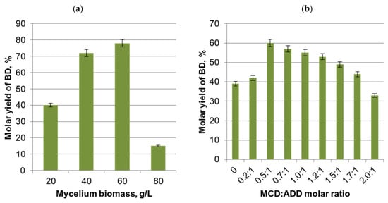 To increase the enzyme pool of the constitutive 17β-HSDs in Curvularia sp. mycelium, the effect of fungal biomass on the 17-keto reduction rate has been studied. A strong positive effect on ADD (10 g/L) conversion with an almost twofold increase in BD yield (to 78%) was observed when increasing the mycelium biomass to 60 g/L (Figure 3, variant 3; Figure 4a), although its further increase to 80 g/L hindered ADD conversion with a drop in BD yield to 15% (Figure 4). Probably, a denser biomass may be the reason for reduced oxygen transport to fungal cells, as was previously suggested when studying DHEA hydroxylation by Colletotrichum lini [44].