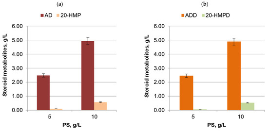 Incubation of M. neoaurum VKM Ac-1815D with PS (5 or 10 g/L) for 96 h resulted in the formation of 2.48 or 4.95 g/L of AD, respectively, whereas PS (5 or 10 g/L) transformation by M. neoaurum VKM Ac-1816D provided the accumulation of 2.47 or 4.9 g/L of ADD (Figure 5). 22-Hydroxy-23,24-bisnorchol-4-ene-3-one (HBC or 20-HMP) or its 1(2)-dehydrogenated analog (20-HMPD) were detected as the main byproducts; however, the yield of C-22 steroid metabolites did not exceed 10–12% (~0.5 g/L) at a PS load of 10 g/L (Figure 5).