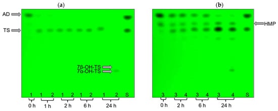 TLC chromatograms of culture broth samples during incubation with Curvularia sp. mycelium: (a)—culture broth containing 2.48 g/L AD (variants 1, 2); (b)—culture broth containing 4.95 g/L AD (variants 3, 4); variants 1, 3—with CHX addition; variants 2, 4—without CHX addition; S—reference steroids in the order (from top to bottom): AD, TS.