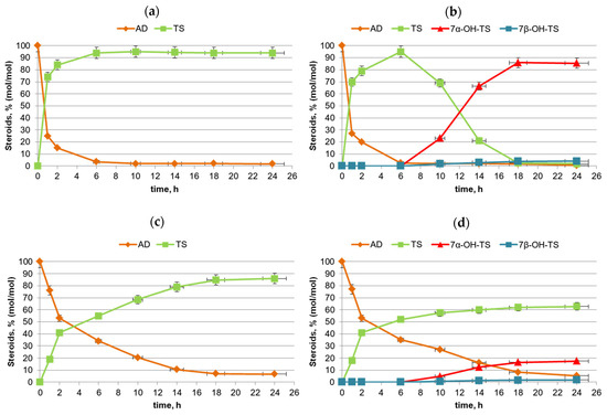Time course of AD bioconversion by Curvularia sp. resting mycelium in culture broth obtained at the first stage of PS cascade biotransformation by M. neoaurum VKM Ac-1815D: (a,b)—culture broth containing 2.48 g/L (8.67 mM) of AD; (c,d)—culture broth containing 4.95 g/L (17.3 mM) of AD; (a,c)—with the addition of the protein synthesis inhibitor cycloheximide (CHX) 0.06 mg/mL; (b,d)—without CHX addition; in variants (b,d) 7α-hydroxytestosterone (7α-OH-TS) and 7β-hydroxytestosterone (7β-OH-TS) were also accumulated.