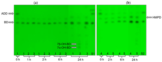TLC chromatograms of culture broth samples during incubation with Curvularia sp. mycelium: (a)—culture broth containing 2.47 g/L ADD (variants 1, 2, 3); (b)—culture broth containing 4.9 g/L ADD (variants 4, 5); variants 1, 4—with CHX addition; variants 2, 3, 5—without CHX addition; variant 3—with MCD addition (0.5:1 molar ratio to ADD); S1—reference steroids in the order (from top to bottom): AD, ADD, BD; S2—ADD, BD.