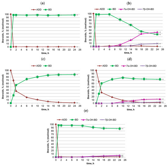 Time course of ADD bioconversion by Curvularia sp. resting mycelium in the culture broth obtained at the first stage of PS cascade biotransformation by M. neoaurum VKM Ac-1816D: (a,b,e)—culture broth containing 2.47 g/L (8.64 mM) of ADD; (c,d)—culture broth containing 4.9 g/L (17.25 mM) of ADD; (a,c)—with CHX addition; (b,d,e)—without CHX addition. Medium supplemented with methylated β-cyclodextrin (MCD) in molar ratio to steroid substrate as 0.5:1 (e); in variants (b,d,e), 7α-hydroxyboldenone (7α-OH-BD) and 7β-hydroxyboldenone (7β-OH-BD) were accumulated.