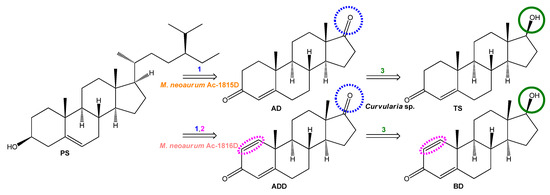 In this study, this strain, in combination with AD- and ADD-producing mycolicibacteria strains, was applied in cascade biotransformations to produce valuable steroid 17β-alcohols (BD and TS) and their 7-hydroxylated derivatives from PS. Transformation of PS to AD by Mycolicibacterium neoaurum VKM-Ac-1815D was followed by AD to TS bioconversion using Curvularia sp. VKM F-3040. To produce BD, a combination of ADD-producing M. neoaurum VKM Ac-1816D with the fungus was applied. Prolonged biotransformation using Curvularia sp. allowed for the production of 7-hydroxylated 17β-hydroxysteroids of the androstane series in cascade bioreactions from PS.