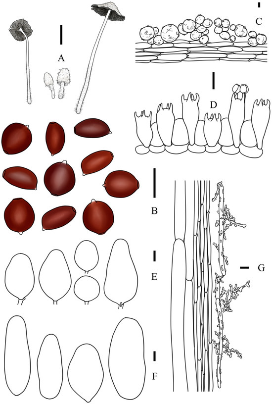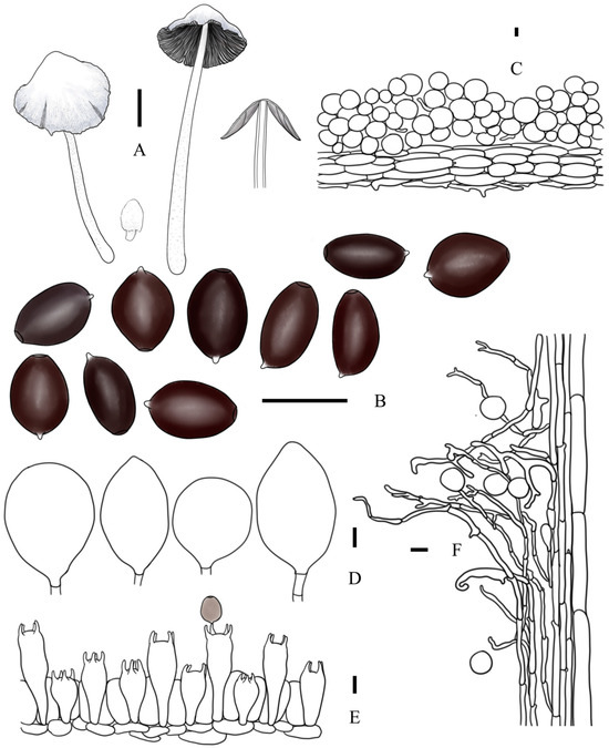 To prepare slides for the microscopic observation, the specimens were sectioned by hand under a stereoscope (stemi 2000C, Zeiss Co., Ltd., Oberkochen, Germany). Then, the slides were prepared in water and 5% aqueous KOH, and 1% Cango Red solution or 1% acetocarmine stain added if necessary. Under a light microscope (BX53, Olympus Co., Ltd., Tokyo, Japan), microscopic features with at least 40 structures for the new species and 20 for the known species were measured, including the size, shape, and color of basidiospores, basidia, pseudoparaphyses, cheilocystidia, pleurocystidia, pileocystidia, caulocystidia, pileipellis, stipipellis, gill trama, subpileipellis, and stipe trama. Additionally, the presence of clamp connection was observed in each sample. Free mature basidiospores collected from the spore print were chosen for observation in front view and/or side view through 1000× magnification and measurement by software EP viewer V1.4 (Olympus Co., Ltd., Tokyo, Japan) with precision to 0.01 μm; the diameter of the germ pore was also measured, and the hilum was excluded under any situation. Statistical results of measured values are presented as (a) b–c (d) form, b–c represent the 90% confidence interval, and (a) and (d) represent minimum and maximum values. Basidiospore sizes are presented as follows: length range × breadth range × width range. The Q value was calculated as Q = length divided by width; when breadth range was measured, Q1 = length divided by breadth range and Q2 = length divided by width [16]; the shape terms corresponding to the Q value were described according to Bas [25]. Other structures were measured and described through 400× magnification. In the case of basidia, the length of the sterigma was excluded from the length of the basidia, and the value of the widest part was chosen as the widest length of cystidia and basidia. The clusters of basidia length were used to classify the morphological types [26,27].
