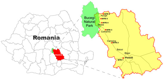 The wild edible indigenous species (i.e., Agaricus bisporus, Agaricus campestris, Armillaria mellea, Boletus edulis, Macrolepiota excoriata, and Macrolepiota procera) used in this study were collected from Prahova County in the summer and autumn of 2023 (Figure 1). The mushroom species chosen for this study were characterized from morphological point of view and nutritional value in a previous study [26]. The sampling sites (two industrial cities, three touristic cities—at the limit with the Bucegi National Reservation—and another one in the transition area) were chosen in order to evaluate the health risk of mushroom consumption depending on their region and species.