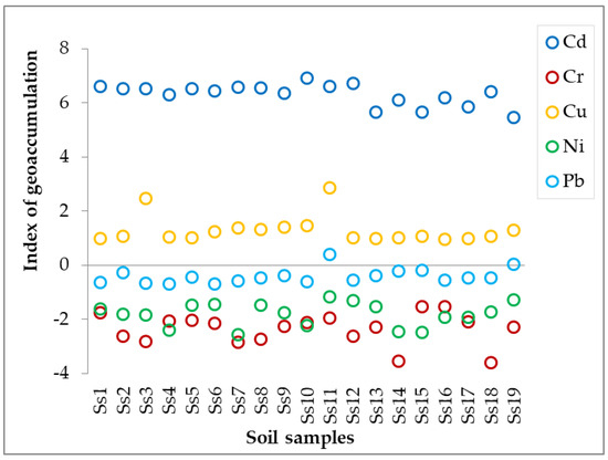 The ICP-MS data represent the first sequence in establishing the contamination level of the studied soils. In this respect, the index of geo-accumulation (Igeo) was calculated according to Equation (1) proposed by Muller [58] and reported by Birch [59]: