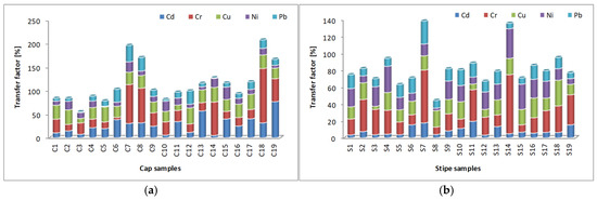 Transfer factor (TF) represents the capacity of the plant (in this case, the capacity of mushrooms) to transfer the metals from soil in their anatomic parts. It is easily calculated as the ratio between metal content in mushroom parts (i.e., cap and stipe) and metal content in soil [27,40,68], expressed in [%]. This factor can explain the risks of human exposure to contaminated soils [41] and the capacity of some species to hyper-accumulate metals, and so, it can be determined if they can be used in soil bioremediation [42].