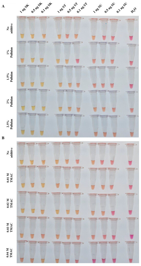 We tested pullulan at concentrations of 1%, 1.5%, 2% and 2.5% (v/v) and TMAC at 0.01 M, 0.02 M, 0.03 M and 0.04 M independently. Although non-specific amplification was suppressed, these concentrations were either insufficient to reduce false-positive signals from S. strictum DNA or reduced the sensitivity for S. kiliense DNA (Figure 2A,B). Overall, lower concentrations at 1% and 1.5% pullulan maintained sensitivity for S. kiliense DNA but resulted in false-positives with S. strictum DNA, whereas the effects of 0.02 M, 0.03 M and 0.04 M TMAC on the LAMP assay were similar regarding non-specific amplification. To overcome this, we further improved the assay by exploring the combined use of the two additives.