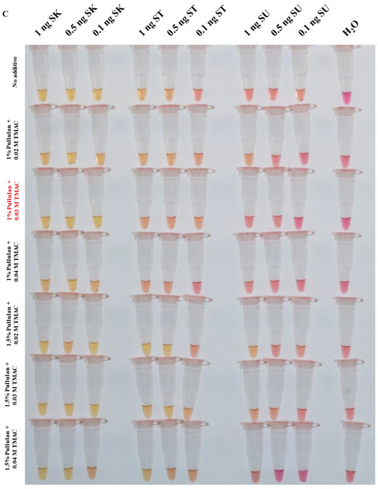 Sarocladium kiliense-specific colorimetric loop-mediated isothermal amplification assay (SK-LAMP) with pullulan and tetramethylammonium chloride (TMAC). Different amounts of additives were added into the SK-LAMP reaction mixtures, and DNA templates from S. kiliense (SK), S. strictum (ST) and S. summerbellii (SU) at 0.1, 0.5 and 1 ng were included for amplification. (A) SK-LAMP assay supplemented with different concentrations of pullulan (1%, 1.5%, 2% and 2.5%; v/v). (B) SK-LAMP assay supplemented with different concentrations of TMAC (0.01 M, 0.02 M, 0.03 M and 0.04 M). (C) SK-LAMP assay supplemented with a combination of pullulan and TMAC at different concentrations: 1% pullulan + 0.02 M TMAC, 1% pullulan + 0.03 M TMAC, 1% pullulan + 0.04 M TMAC, 1.5% pullulan + 0.02 M TMAC, 1.5% pullulan + 0.03 M TMAC and 1.5% pullulan + 0.04 M TMAC. Amongst all the conditions, the combination of 1% pullulan + 0.03 M TMAC was found to be optimal (highlighted in red font).