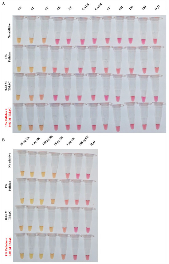 Analytical specificity and analytical sensitivity tests for the optimised Sarocladium kiliense-specific colorimetric loop-mediated isothermal amplification assay (SK-LAMP). No additive, 1% pullulan, 0.03 M TMAC or 1% pullulan + 0.03 M TMAC was added in the SK-LAMP reaction mix for (A) analytical sensitivity test and (B) analytical specificity test. DNA from the fungal species S. kiliense (SK), S. strictum (ST), S. summerbellii (SU), Acremonium egyptiacum (AE), Aspergillus fumigatus (AF), Candida albicans (CALB), Candidozyma auris (CAUR), Fusarium keratoplasticum (FU), Rhizopus microsporus var. chinensis (RH), Talaromyces marneffei (TM) and Trichophyton mentagrophytes (TRI) were used in the tests.