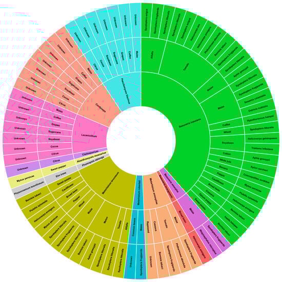 The endophytic entomopathogenic fungi of this type have been identified among plants of agricultural significance (Figure 1), including Zea mays [], Glycine max [], Theobroma cacao [], Saccharum [], Vitis labrusca [], Coffea Arabica [], and some Citrus species [], Medicago sativa, Solanum lycopersicum, Cucumis melo, Triticum [,], Gossypium spp. [], Corchorus capsularis [], Musa spp. [], Capsicum spp. [], Brassica oleracea [], Vicia faba [], Ipomoea batatas [], Manihot esculenta [], Papaver somniferum [], Brassica napus [], Ulmus spp., Vitis vinifera, and Saccharum officinarum [].