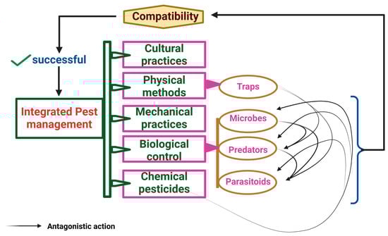 Problems with any reasonable solutions are always expected. Likewise, here, for all successful endophytic fungal organisms, the artificial problem is one of the management practices we follow, like pesticides and botanicals. On the other hand, the endophytic organism should not cause problems to the entomophagous natural enemies. However, employing entomopathogenic fungi in integrated pest management (IPM) in combination with other biocontrol agents, such as parasitoids and predators [,,], and with botanicals will lead to environmental safety measures [] (Figure 3). Similarly, compatibility between all the management measures is necessary.
