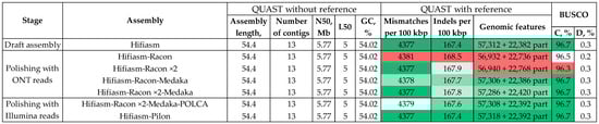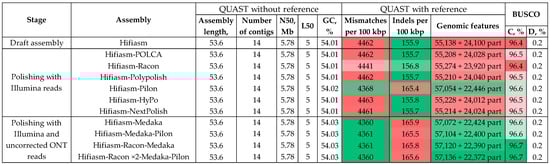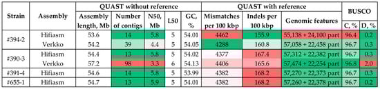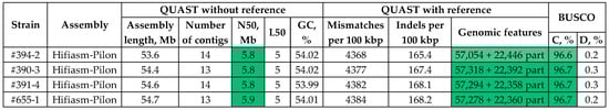 - Gurevich, A.; Saveliev, V.; Vyahhi, N.; Tesler, G. QUAST: Quality assessment tool for genome assemblies. Bioinformatics 2013, 29, 1072–1075. [Google Scholar] [CrossRef] [PubMed]