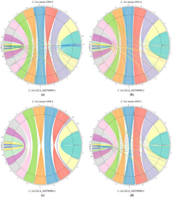 3.3. Comparative Analyses of Four C. lini Genome Assemblies