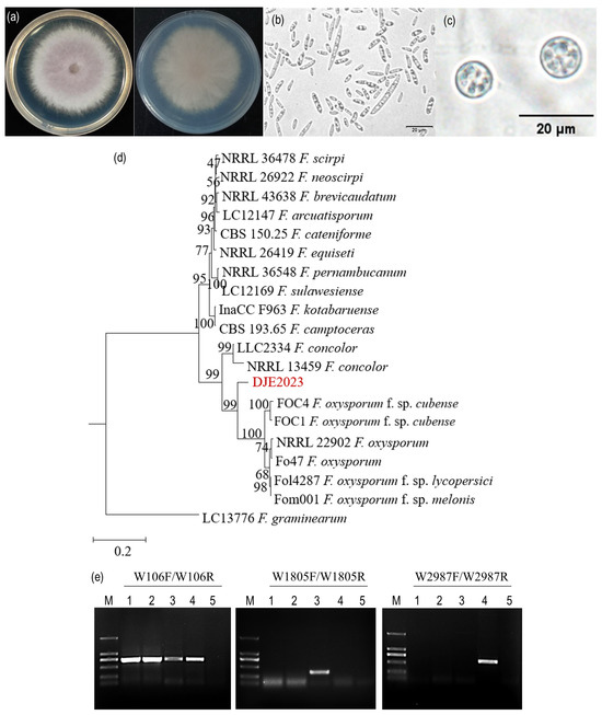 Identification of endophytic fungus DJE2023 from banana cv. Dajiao. (a) The colony morphology of DJE2023. (b) Conidia. (c) Chlamydospores. (d) Multigene system phylogenetic tree. (e) Molecular identification using specific primers for Fusarium oxysporum f. sp. cubense (Foc) races 1 and 4. Among them, W106F/W106R are the universal primers for F. oxysporum, W1805F/W1805R are the specific primers for race 1of Foc, and W2987F/W2987R are the specific primers for race 4 of Foc. M: DL2000 Marker; 1,2: DJE-2023; 3: FOC Race 1; 4: FOC Race 4; 5: Water control.