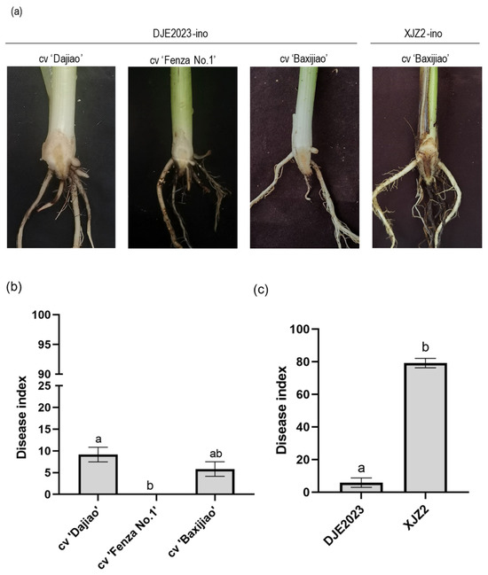 The pathogenicity test results for the banana endophytic strain DJE2023 and the Fusarium oxysporum f. sp. cubense (Foc) race 4 strain XJZ2. (a) The typical symptoms exhibited in the rhizomes of various banana cultivars. (b) The disease incidence statistics resulting from inoculating strain DJE2023 onto various banana cultivars. (c) The disease incidence statistics resulting from inoculating DJE2023 and XJZ2 onto banana cv. Baxijiao. The inoculation data of 30 plantlets were randomly divided into three groups for statistical analysis and the mean ± S.D. (n = 3). The significant difference (Duncan test, p < 0.05) between two groups is represented by the superscript letters above the error bars.
